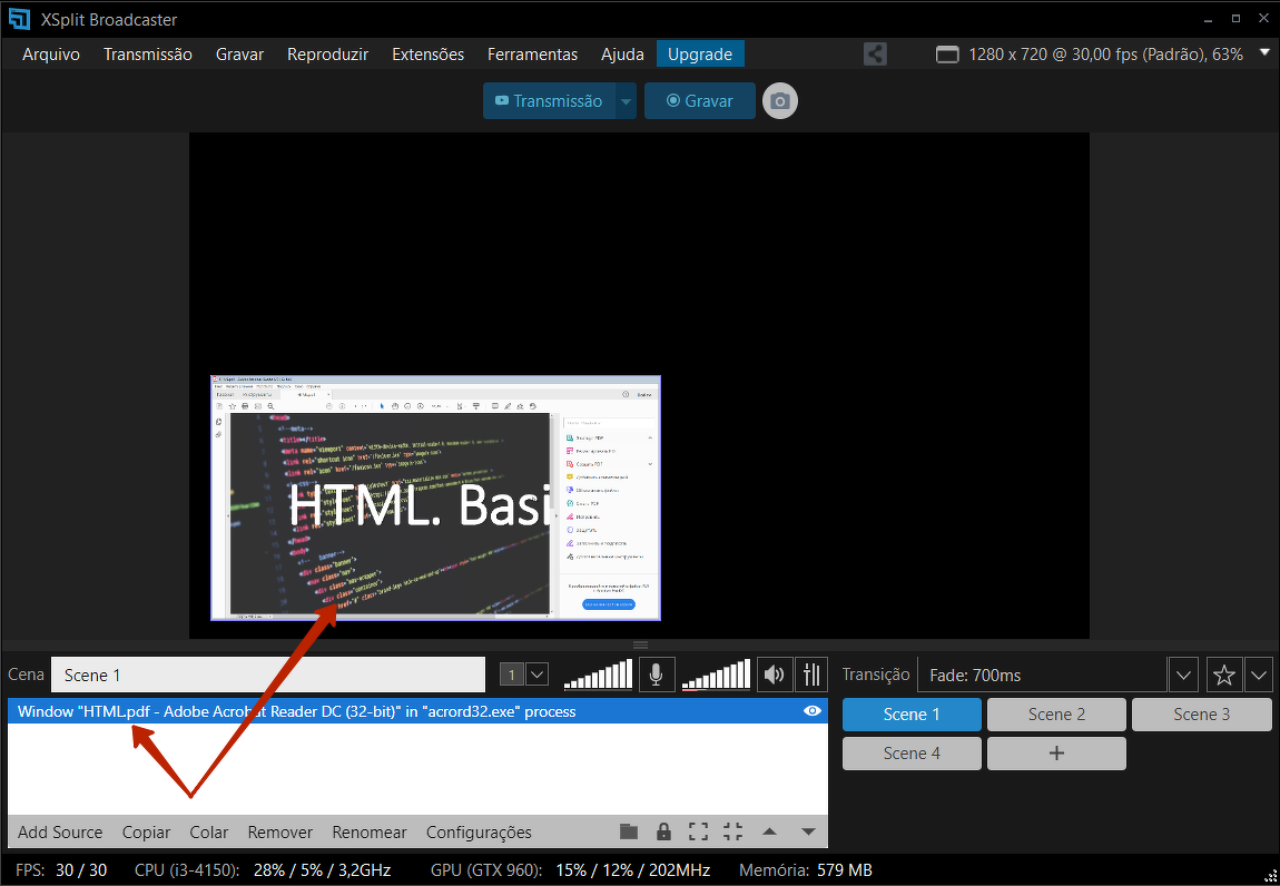 Inicie a apresentação no seu computador, ative o modo de tela cheia. Sem minimizar a janela de apresentação, vá para a janela Xsplit pressionando Alt+Tab e clique em "Adicionar Fonte" => "Captura de Tela" => "Captura de Janela" => Selecionar a janela com a apresentação.