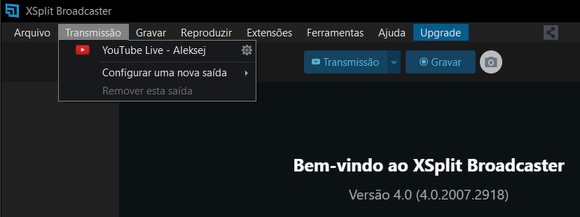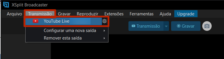 Para iniciar um fluxo de vídeo no Youtube por meio do XSplit, clique no menu "Transmissão" => Seu canal.