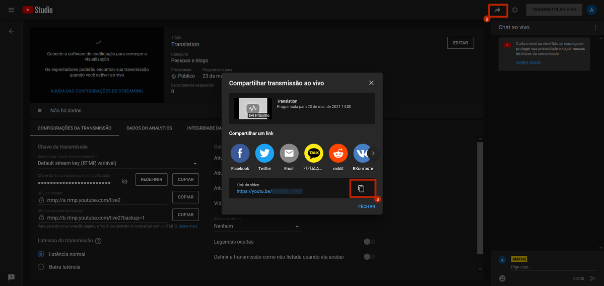 Imediatamente depois disso (ou imediatamente antes disso), inicie o fluxo de vídeo no YouTube, isso é importante para a gravação correta do script.