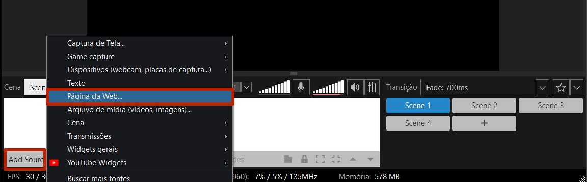 5. Fonte (s) da cena atual. As fontes incluem imagens, arquivos de vídeo, demonstrações de tela, janelas de programas, imagem da webcam, créditos escritos manualmente e muito mais. Você pode adicionar a fonte desejada usando o botão "Adicionar Fonte", que mostrará uma lista de todas as fontes possíveis.
