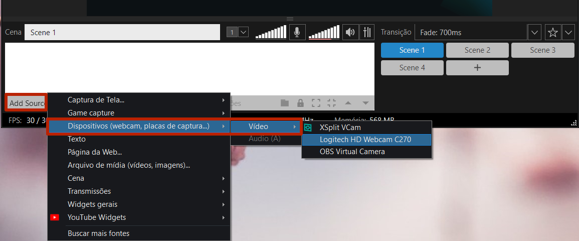Para adicionar uma webcam, é preciso clicar no botão "Adicionar Fonte" = > "Devices" = > "Vídeo" = > Selecionar webcam.