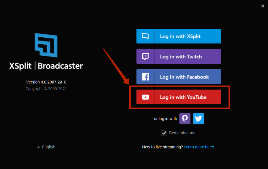 Após iniciar o programa, você precisa fazer login, por exemplo, através do YouTube.
