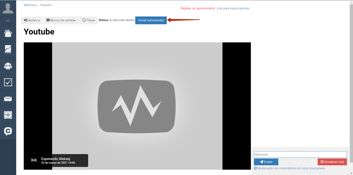 Abra a sala. Nesse momento, os espectadores terão a página do teaser automaticamente ligada à sala. Também nesse momento, o sistema começará automaticamente a gravar o script.