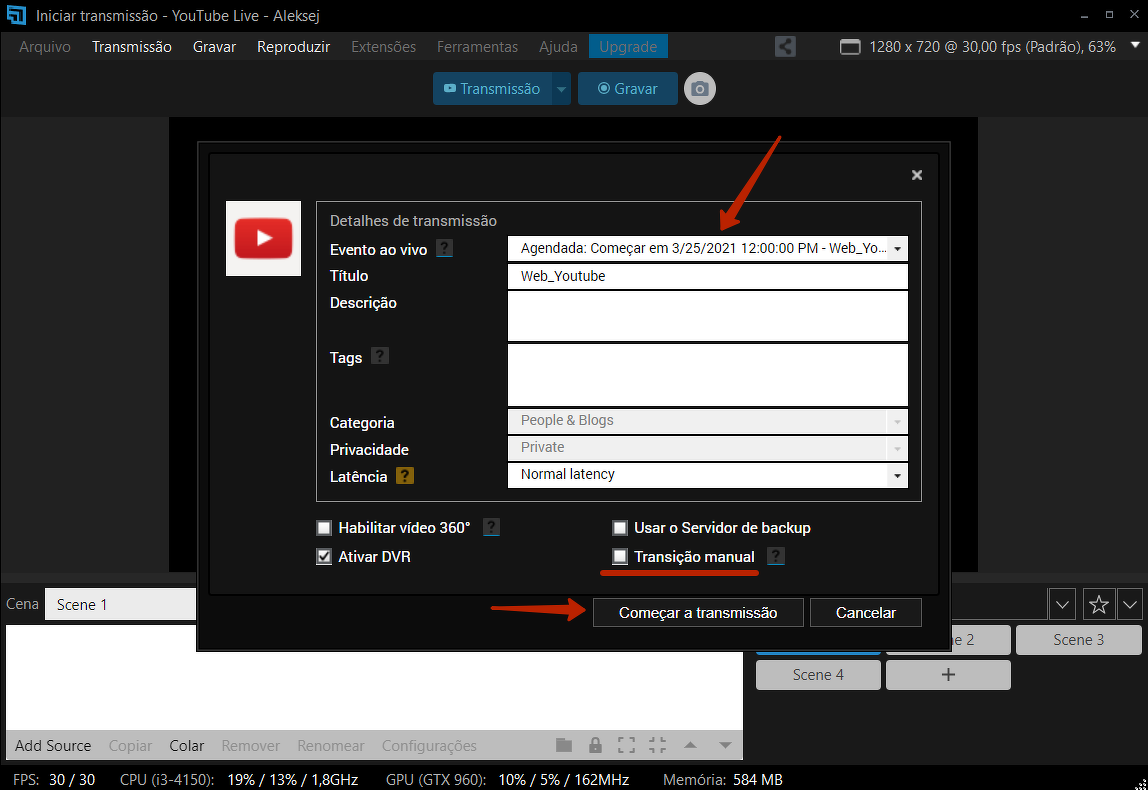 2. Transmissão. Depois de ter todas as cenas e o tipo de transmissão configurados, você pode clicar no botão com o nome do seu canal para iniciar a transmissão.
