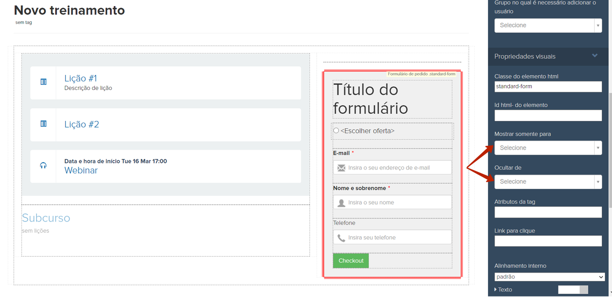 É possível colocar um formulário de vendas para a compra do próximo nível diretamente no treinamento?