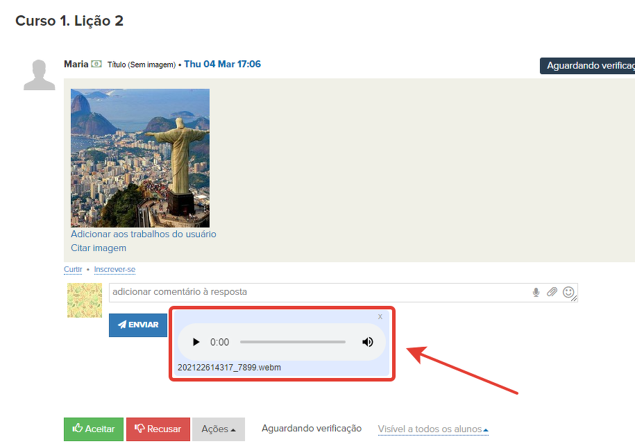 Se desejar, o professor pode gravar uma mensagem de voz em resposta à tarefa concluída pelo aluno: