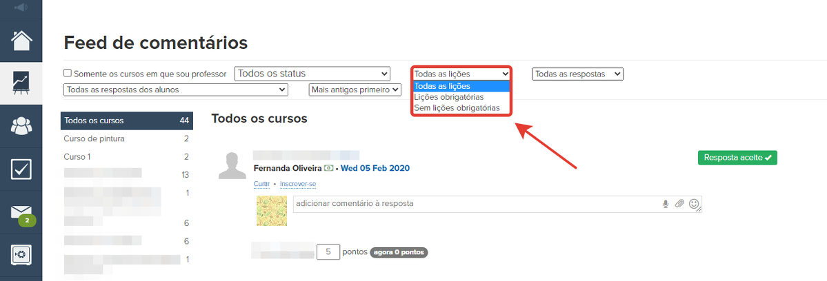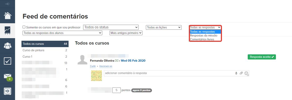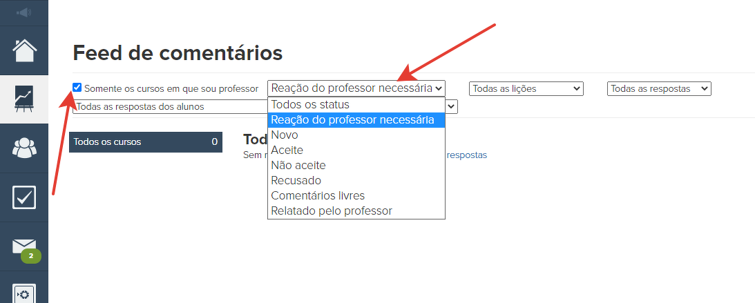 Também é possível optar por exibir todas as respostas, as respostas às tarefas ou apenas os comentários à aula.