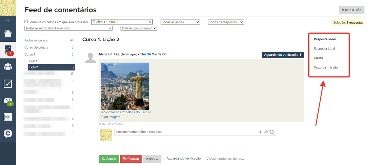 Se no Feed de resposta for selecionada uma aula específica para avaliação, à direita ficará visível o texto da tarefa e a resposta ideal.