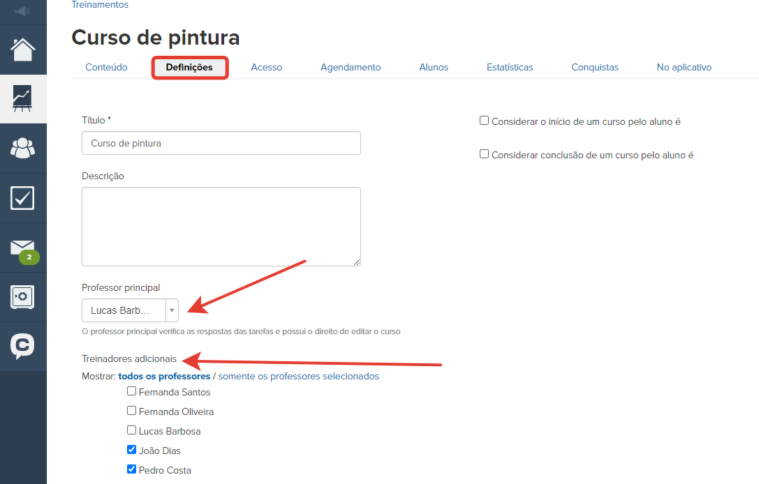 Para que seu funcionário possa avaliar as respostas dos alunos, ele deve ser designado como o professor titular ou adjunto do treinamento: