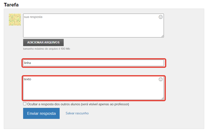 Os campos adicionais "linha" e "texto" permitem que o aluno insira uma resposta de texto a uma pergunta específica.