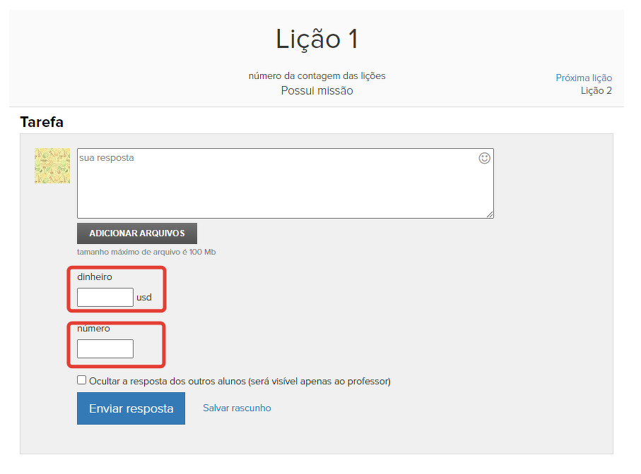Os campos adicionais "dinheiro" e "número" permitem que os alunos enviem informações numéricas na resposta:
