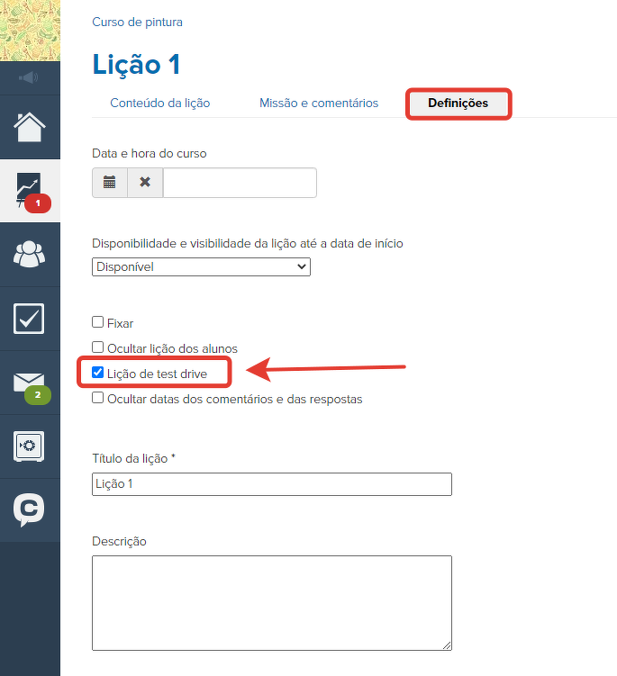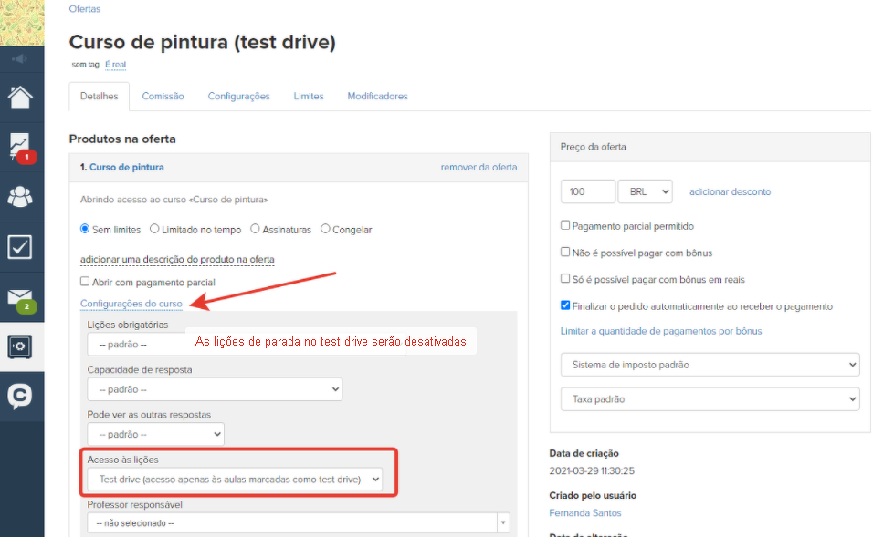 Nas configurações de aprovação do treinamento na oferta, deve-se destacar que o acesso é concedido apenas às aulas para test drive: