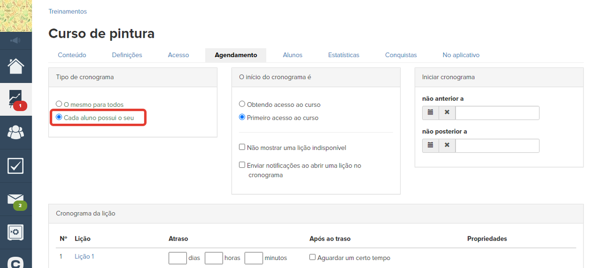 No segundo caso, é utilizado a programação do tipo "Igual para todos", e as configurações das aulas indicam que elas não estão disponíveis antes da data de início: