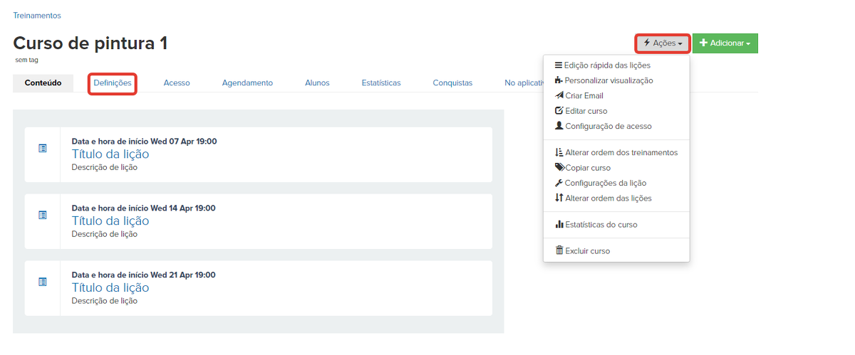 Após a criação do curso, a edição rápida das aulas estará disponível, e com ela você pode: