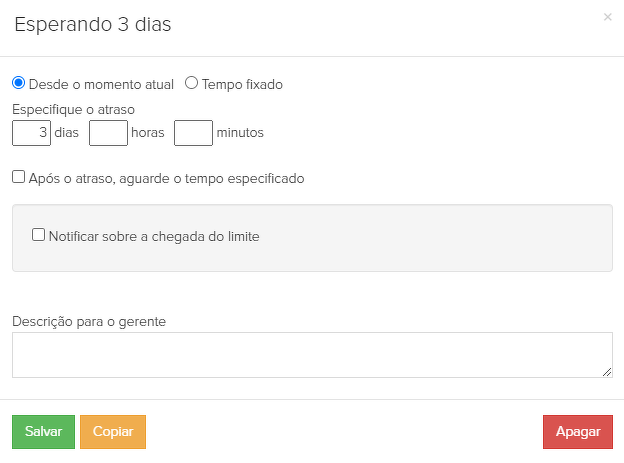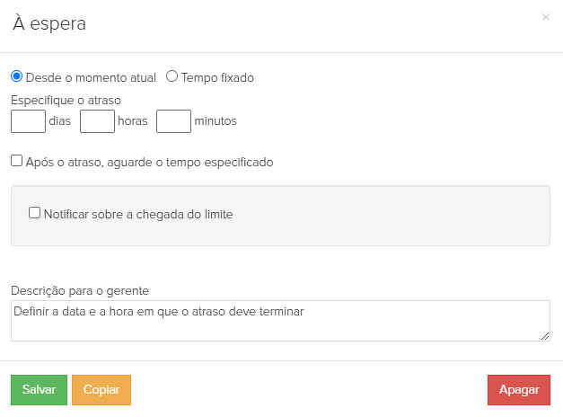 26. "À espera" - um atraso sem tempo definido. O próprio gerente deve definir a data e a hora em que o atraso deve terminar. Após o atraso, o subprocesso com chamadas começará novamente.