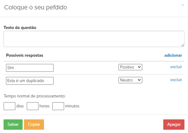 8. "Coloque o seu pefdido" é um bloco "Pergunta ao gerente" com duas opções de resposta: "Sim" e "Este é um duplicado".