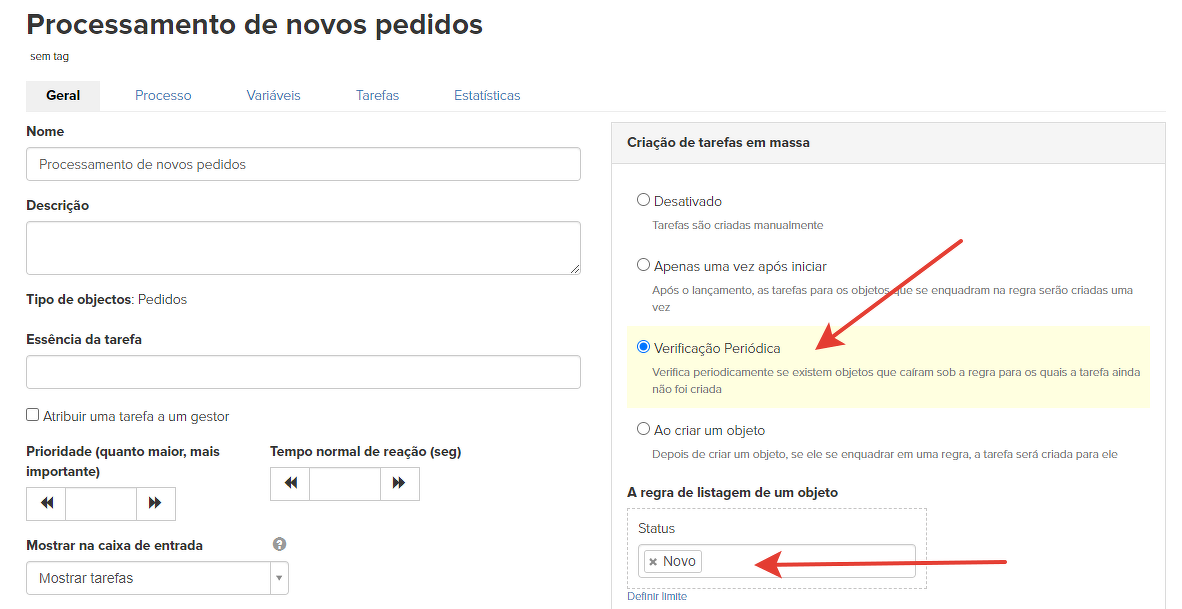 Especificamos o tipo de verificação de objetos para criação em massa de tarefas. Nesse caso, o tipo de verificação "Ao criar o objeto" ou "Verificação periódica" é apropriado. Todos os novos pedidos correspondentes à condição entrarão no processo.
