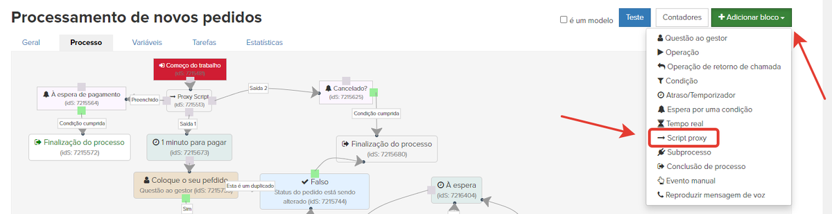 Acrescentamos e configuramos os blocos de processo que precisamos. Começamos com o bloco "Proxy script":