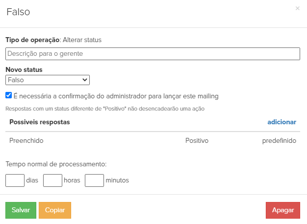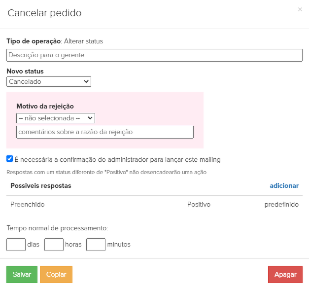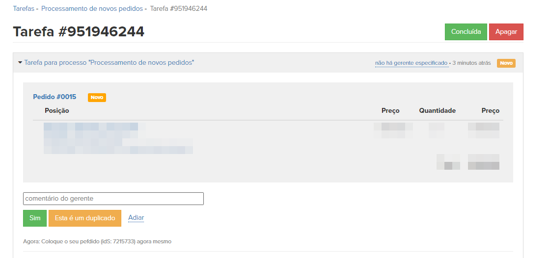 9. "Falso" - se o cliente criou acidentalmente duas ordens idênticas, uma delas será marcada como dupla e apagada pelo gerente, mudando o status da ordem para "Falso". Tal ordem não será exibida na lista de pedidos e não afetará as estatísticas. Após a eliminação do pedido, o processo fica concluído (6):