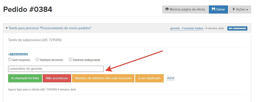 Após o atraso, ligamos novamente para o cliente e o lembramos sobre o pagamento, esclarecemos seus planos. Trabalhamos com a tarefa até o cliente pagar pelo pedido (neste caso, a tarefa é concluída automaticamente), ou até que o cliente cancele o pedido (diz que não planeja pagá-lo).