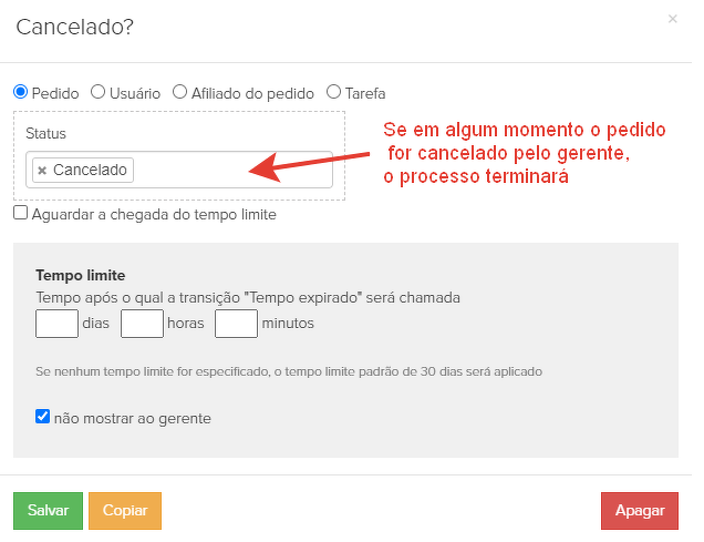 5. "Cancelado?" - condição pendente: o estado do pedido é "Cancelado". Se em algum momento o pedido for cancelado pelo gerente, o processo terminará (6).