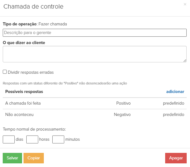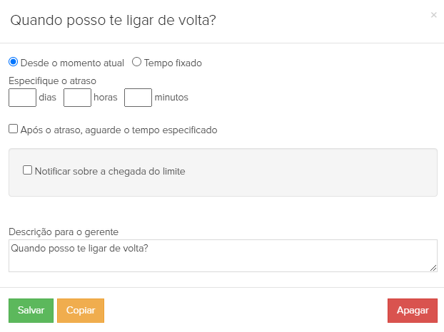 31. "Quando posso te ligar de volta?" - atraso sem um tempo definido. O próprio gerente tem que definir uma data e uma hora em que o atraso deve terminar. Após o atraso, o sub-processo começará novamente com chamadas para lembrar novamente o cliente sobre o pagamento.