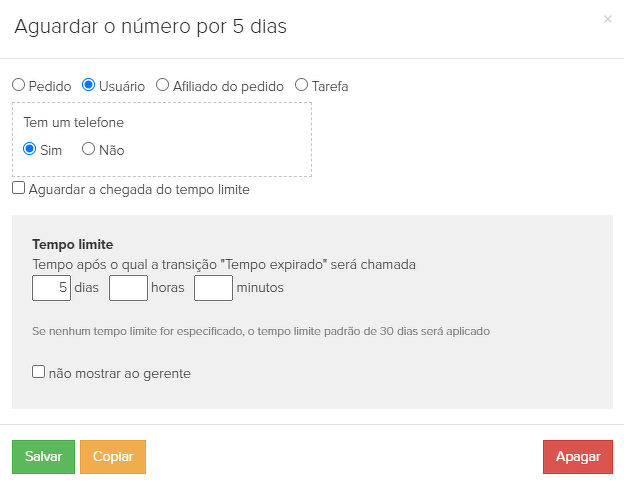 16. "Aguardar o número por 5 dias" - à espera da condição. Dentro de cinco dias o processo verifica se o número de telefone aparece no perfil do cliente.