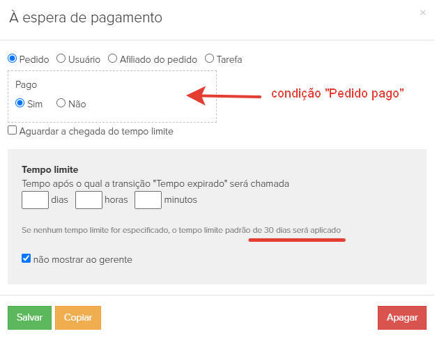 3. "À espera de pagamento" - à espera da condição "Pedido pago". Dentro de 30 dias após o início do processo, o sistema verifica se o pagamento do clienet foi recebido. Se o pedido tiver sido pago, o processo termina (4), não são tomadas mais medidas sobre este pedido (para não perturbar o cliente com chamadas desnecessárias, cartas, etc.).
