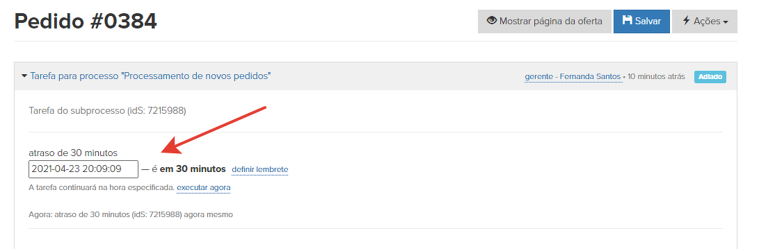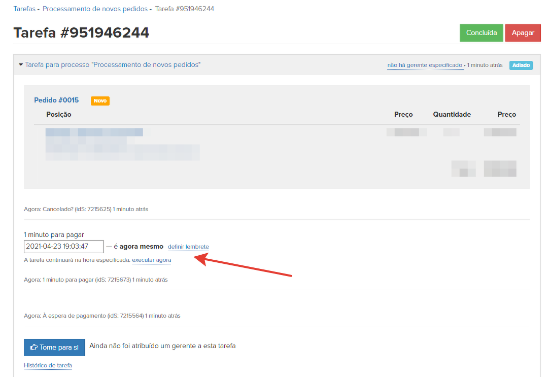 Este atraso é necessário para que o gerente não comece a ligar imediatamente para o cliente quando o pedido é feito. Damos ao cliente a oportunidade de pagar sozinho, e se ele não tiver pago, então começamos a entrar em contato com ele.