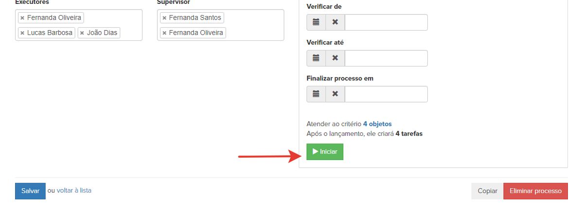 Quando o processo é construído, ele pode ser testado.