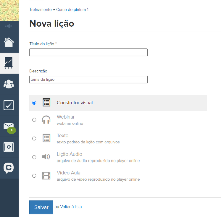 Os cursos podem consistir em aulas e subcursos. Para criar uma aula em um curso, você deve clicar no botão "Adicionar lição" e selecionar o tipo de aula desejado.
