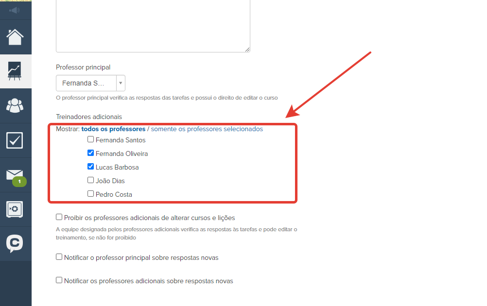 Você pode designar apenas um professor principal ou adicionar professores adicionais: