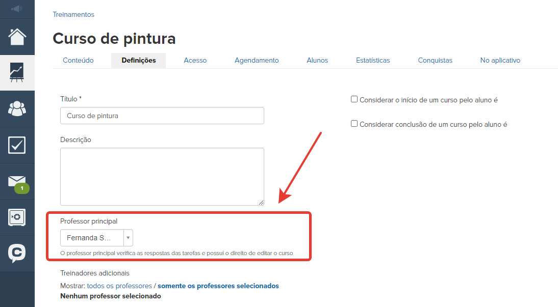 Para designar o professor principal do curso, você deve selecionar o funcionário desejado nas configurações do curso:
