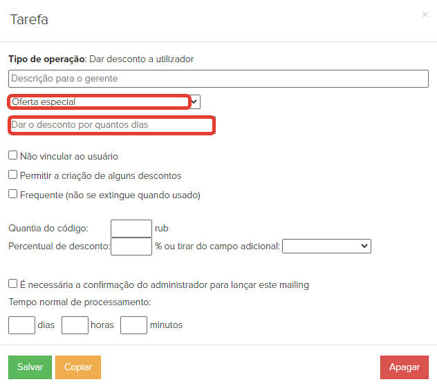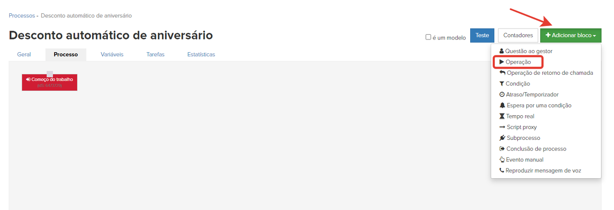 Em seguida, configurar o próprio processo. É necessário selecionar uma condição para os usuários para os quais o processo funcionará - "Aniversário": "hoje" e, no processo, colocar o bloco "Operação" - "Emitir um desconto para o usuário".