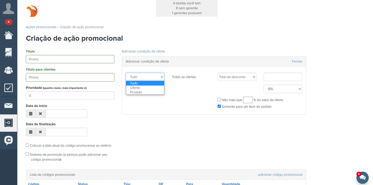 Para a promoção, você precisa criar um código promocional. Você pode criar vários códigos promocionais.