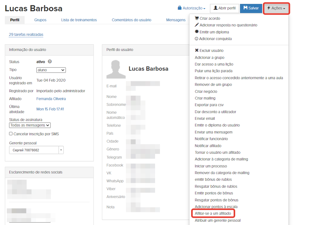 Você também pode atribuir manualmente um usuário a um parceiro. Para fazer isso, no cartão do usuário, clique na aba Ações - Atribuir a afiliado.