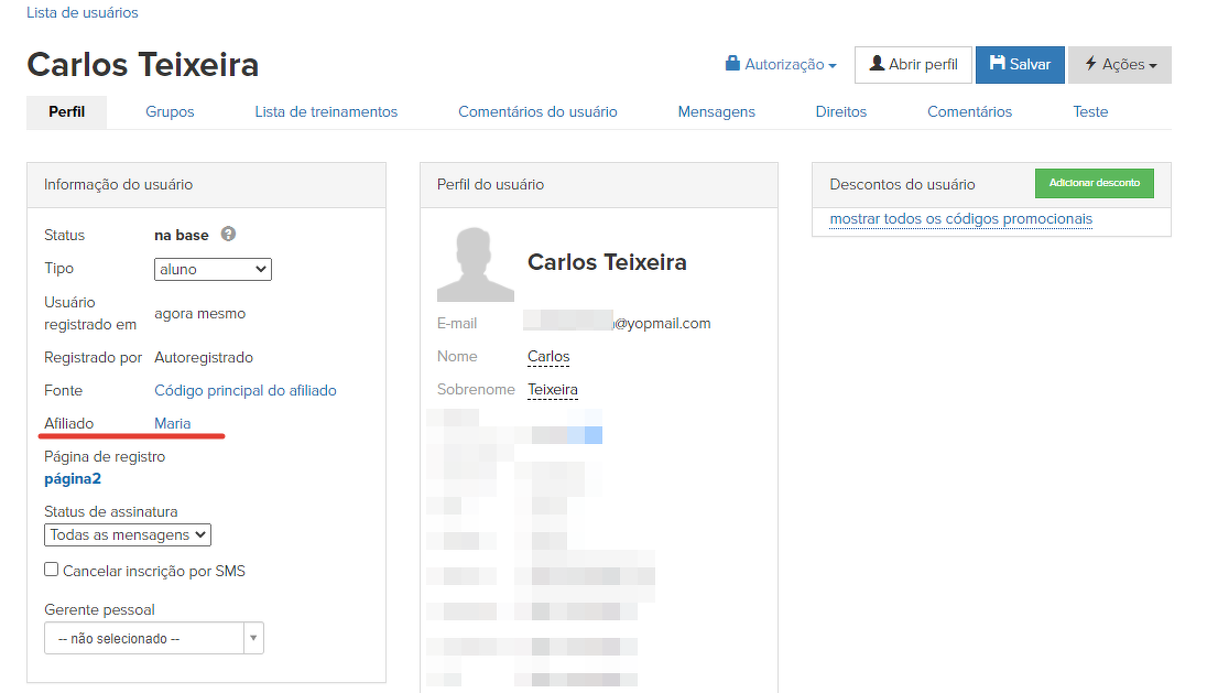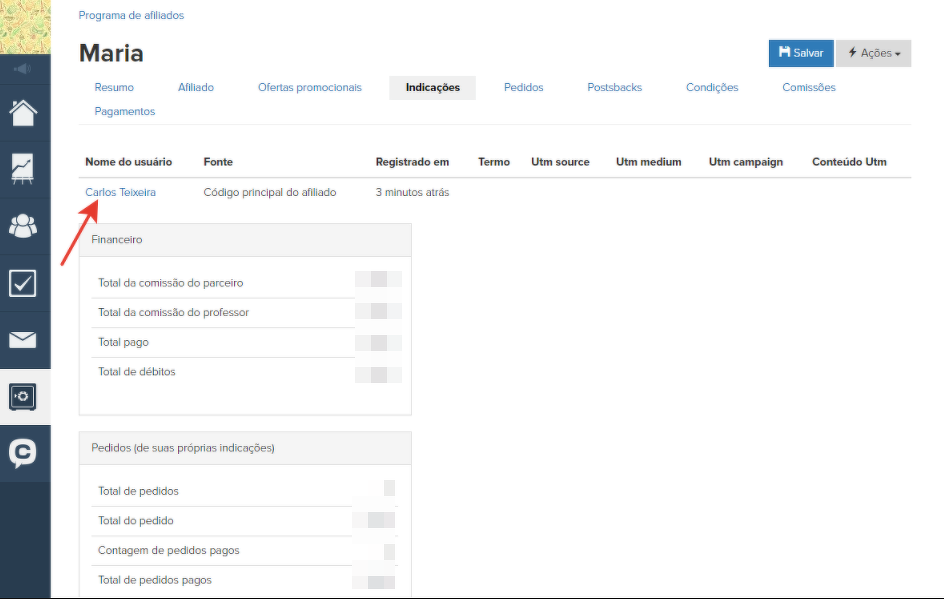 Dessa forma, você pode especificar que o usuário foi trazido por um parceiro ou alterar o parceiro atual. Isso também será refletido na conta pessoal dos parceiros.