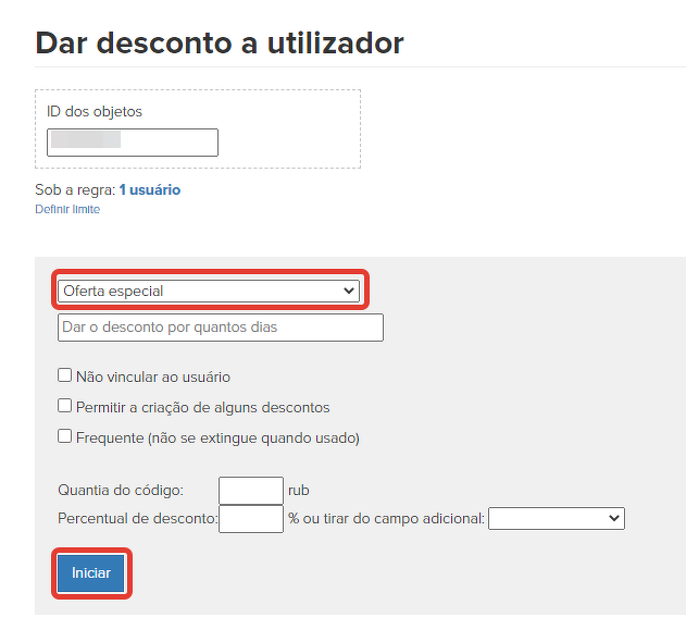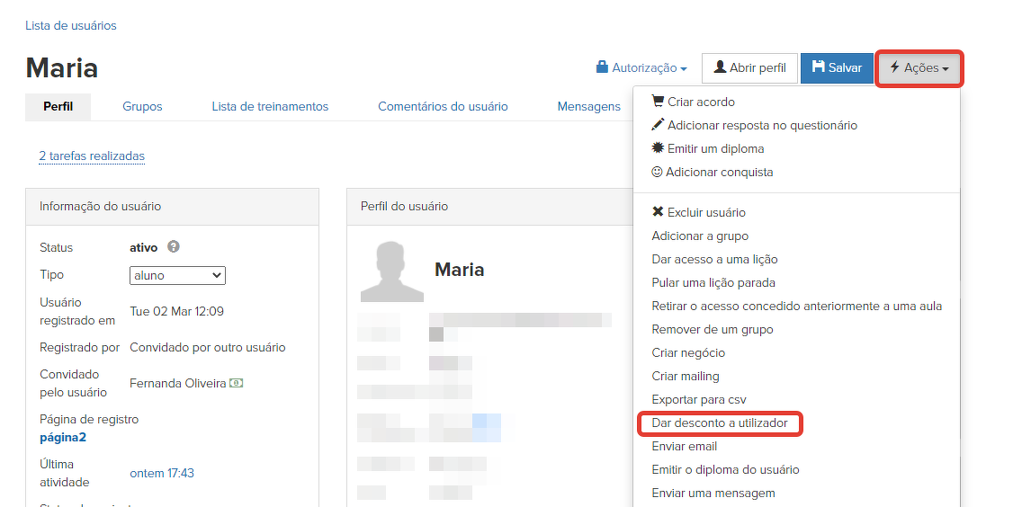 1. Para emitir um código promocional para o usuário, você deve ir ao perfil desse usuário, clicar no botão "Ações "e selecionar "Emitir um desconto para o usuário".