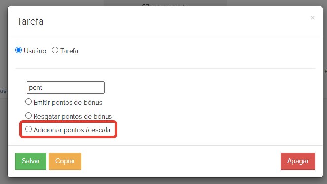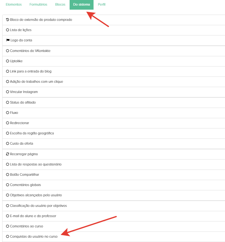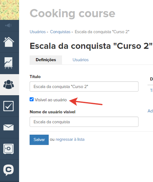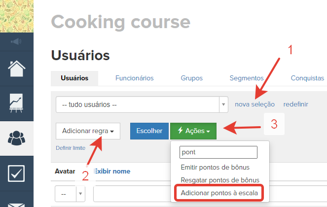 "Escala de conquistas" - é uma funcionalidade na qual é possível atribuir pontos ao usuário. Pode haver quantos pontos você quiser. Você pode creditar pontos automaticamente ou manualmente pela resposta de um aluno a uma tarefa. Você também pode creditar pontos por meio de uma ação arbitrária.