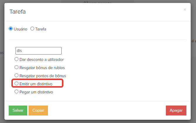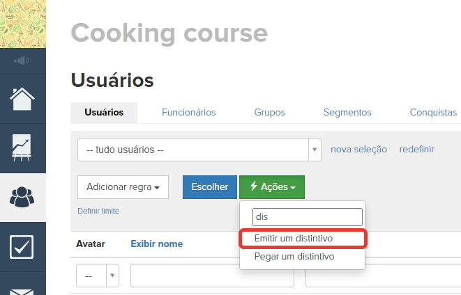 Por meio da operação "Retirar medalha digital", você pode retirar a medalha de um usuário específico ou de vários.