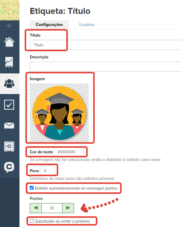 Para cada medalha digital, você pode carregar uma imagem e configurar a emissão automática ao se atingir um determinado número de pontos.