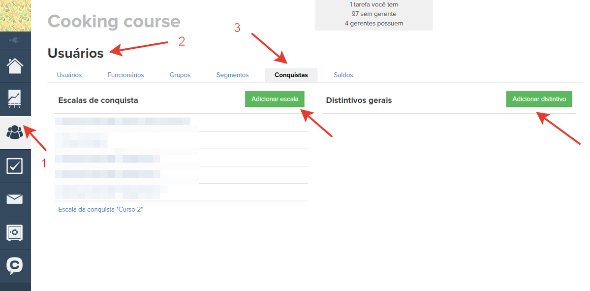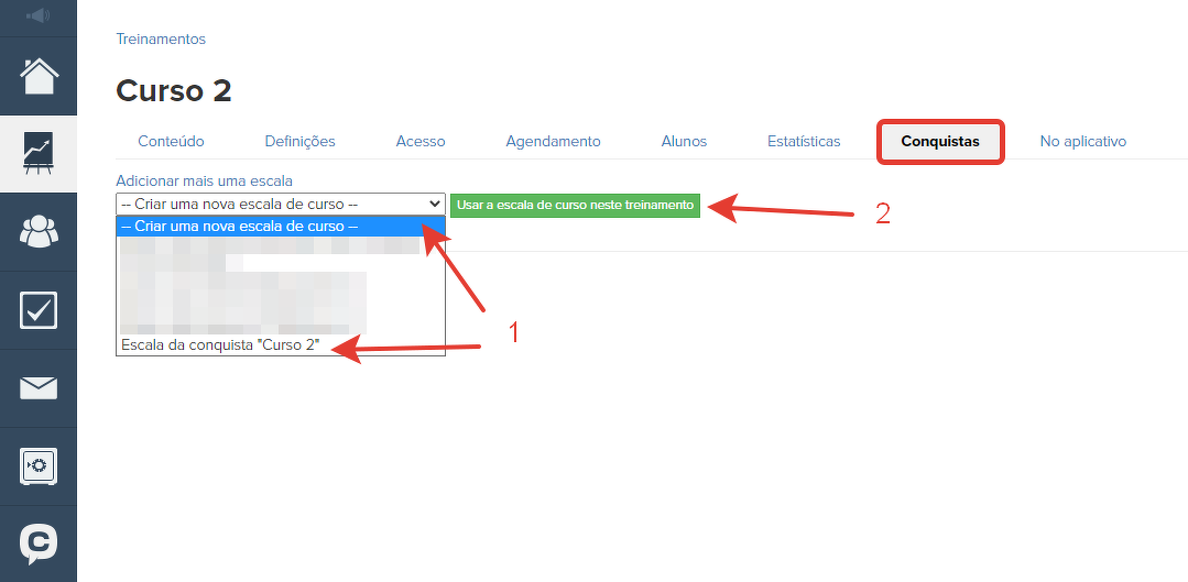 Dentro do curso, a aba de "Conquistas" é exibida para o administrador. Lá, você pode escolher a escala que o curso usa para registrar os resultados.