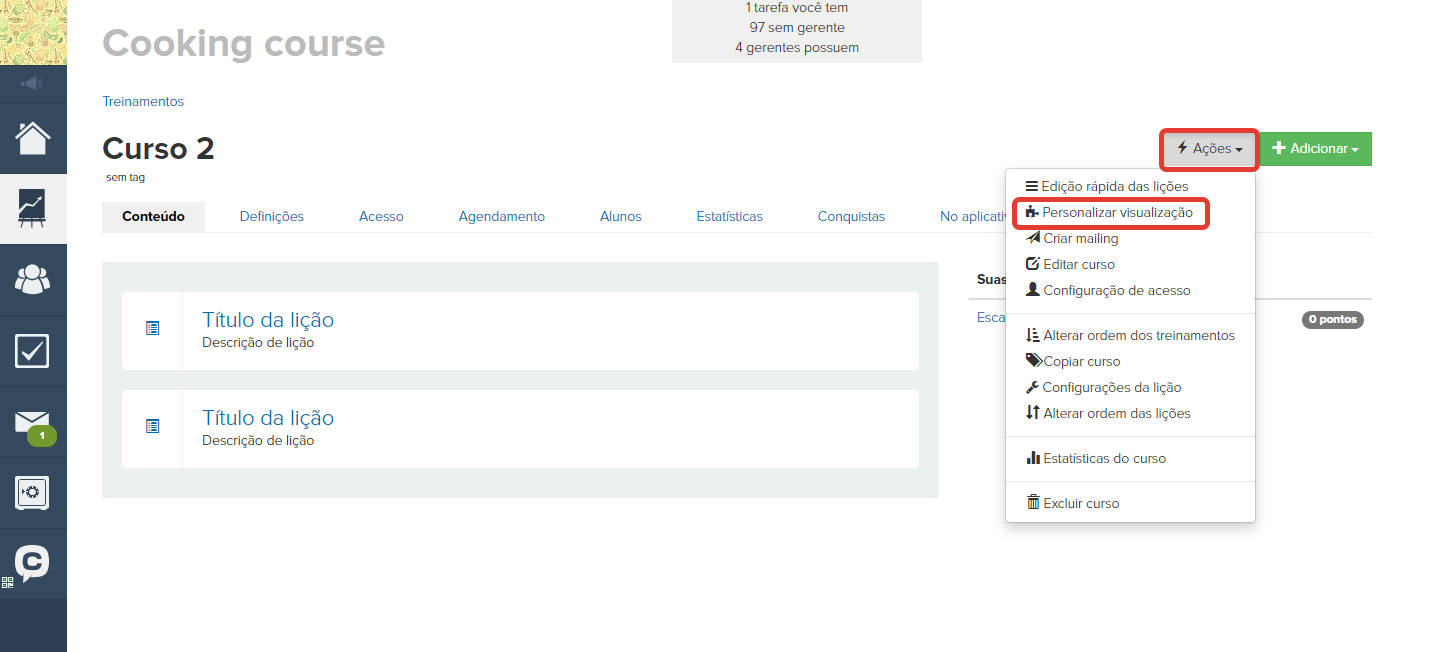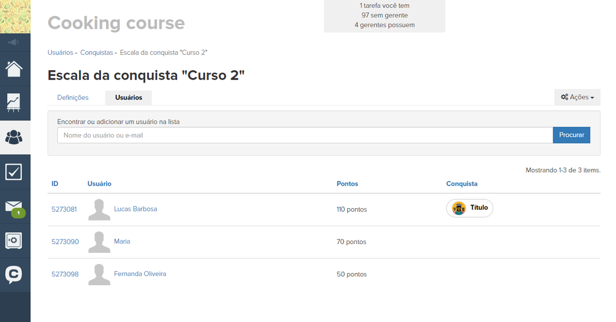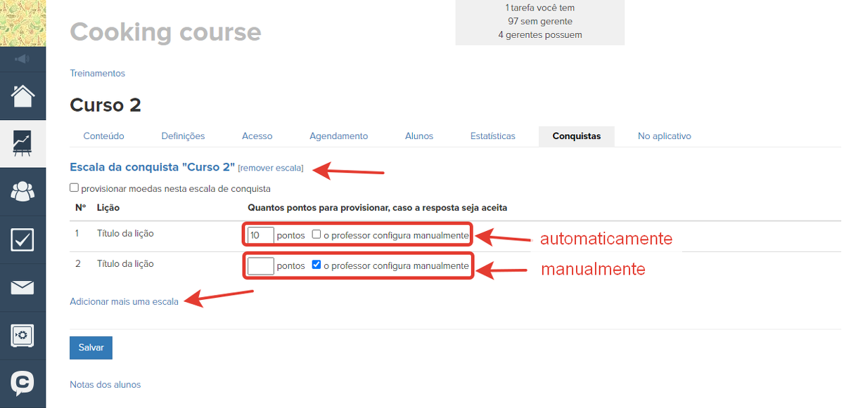 Para fazer isso, adicione uma "escala de conquistas" ao curso e configure o crédito de pontos aos alunos - por tarefas concluídas ou aulas assistidas.