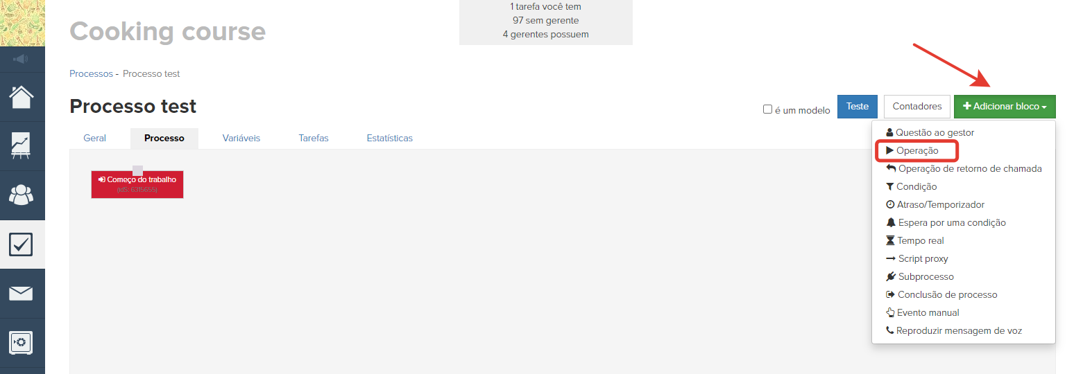 A operação está disponível nos processos, no cartão do usuário e na seleção de usuários.