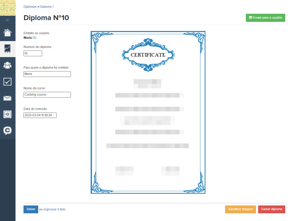 Na próxima aba, você pode atualizar a imagem, excluir o diploma ou enviá-lo ao usuário:
