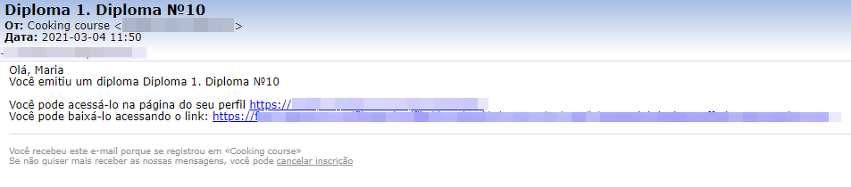 Após o envio do diploma, o usuário receberá uma notificação por e-mail: