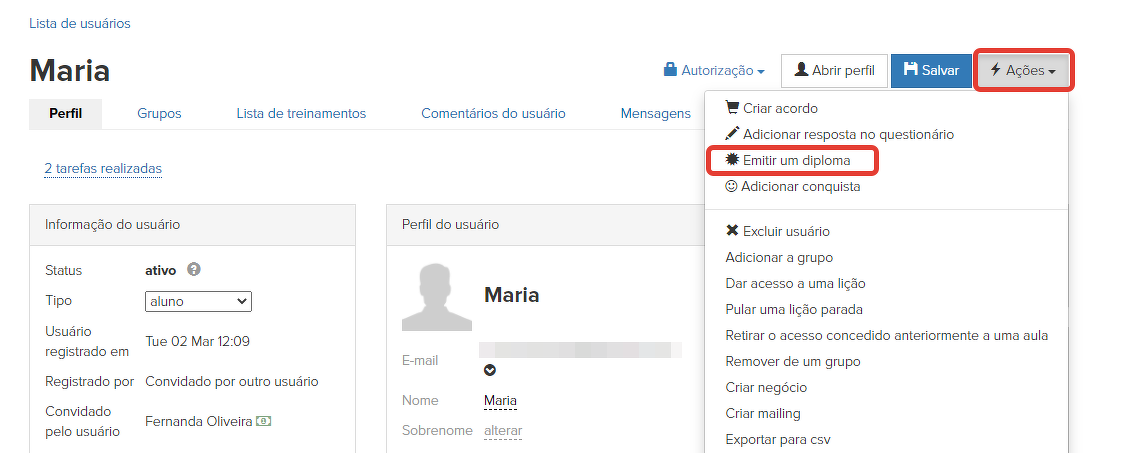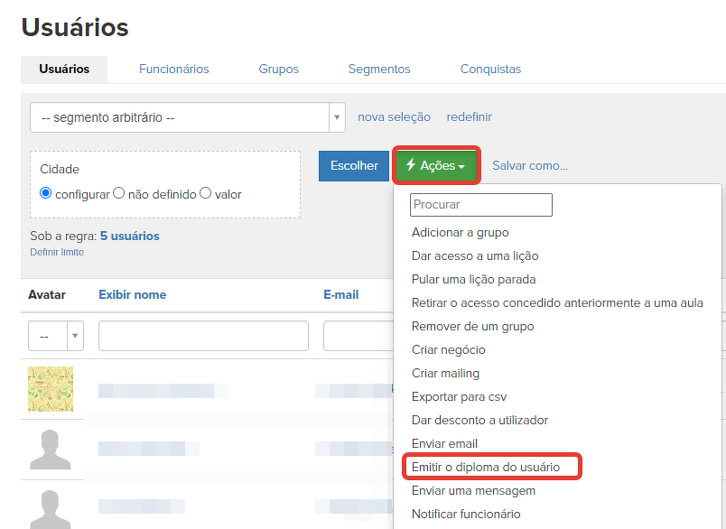 A ação "emitir um diploma para o usuário" também está disponível para o segmento de usuários e nos processos.