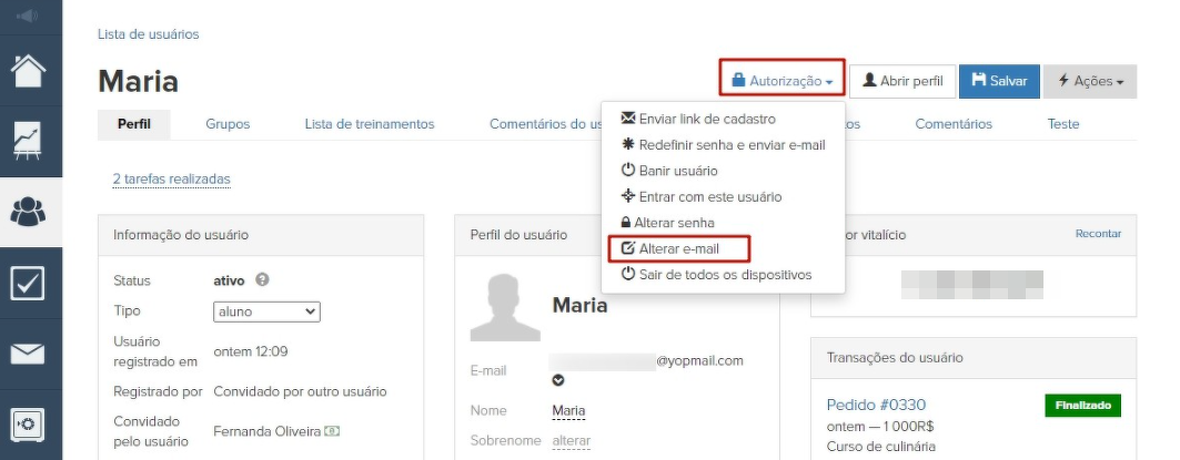 Para alterar o endereço de e-mail, você deve acessar o perfil do usuário