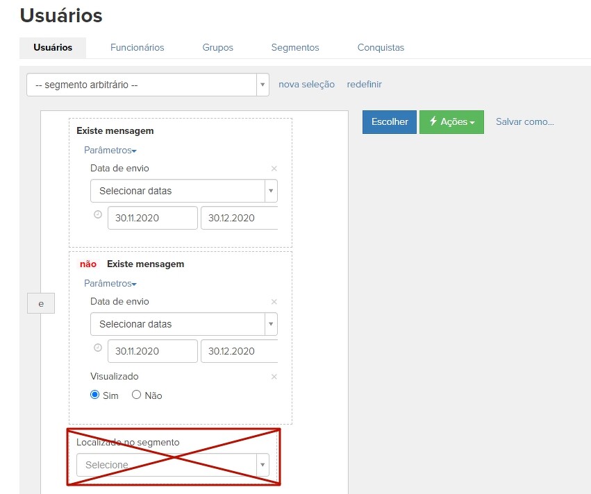 Atenção! O segmento de usuário para exclusão não deve conter a condição "Localizado no segmento", caso contrário, pode haver uma exclusão incorreta, por exemplo, se os segmentos contiverem condições mutuamente exclusivas.