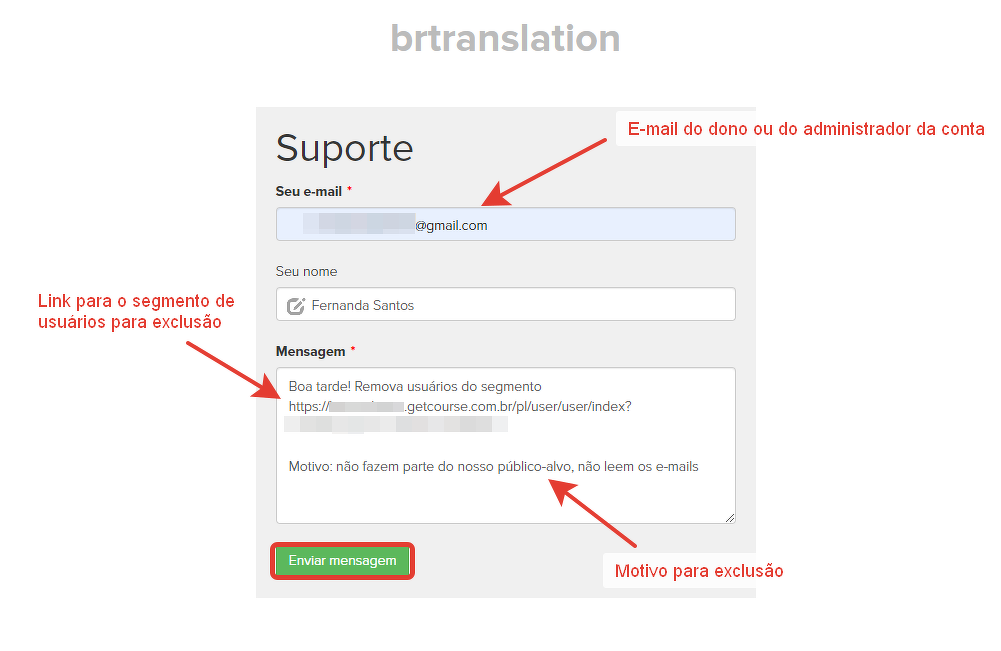 Anexe à solicitação um link para o segmento de usuários salvo e indique o motivo da exclusão.